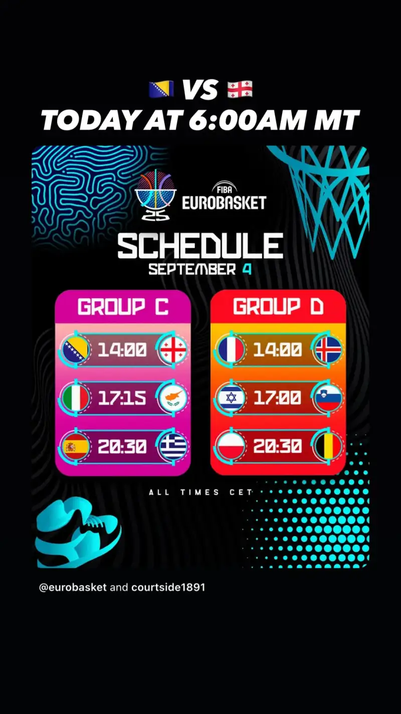 虎扑09月04日讯 爵士官方更新ins,晒出了今日的欧锦赛小组赛赛程。