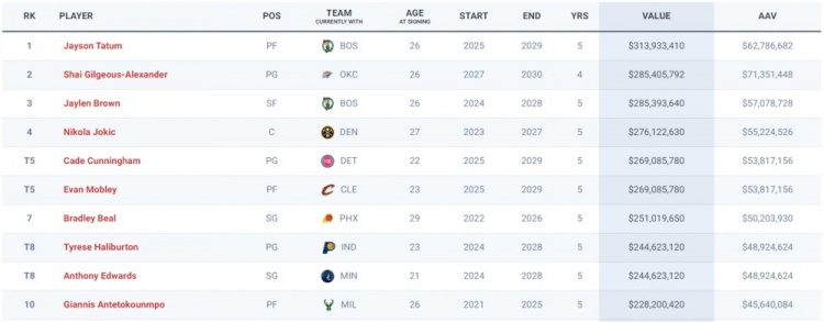 NBA历史大合同TOP10目前如下: