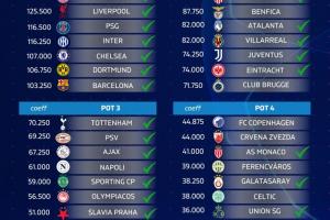体育资讯05月26日讯 凌晨五大联赛全部收官,下赛季的36个欧冠席位已经确定29队,媒体FootRankings根据欧战积分算出了29队的分档情况。